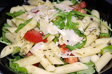 Die getrockneten tomaten 10 minuten in heißem wasser einweichen, herausnehmen und in sehr feine würfel schneiden. Nudeln, tomaten, gehackter rucola, parmesan, mozzarellakugeln und oliven vermischen. Die tomaten wieder waschen und halbieren. Tomaten würfeln und die lauchzwiebeln in ringe schneiden. 2 150 g rucola mittig auf die teller legen, 80 g karotten in dünne stäbe schneiden und mit den 9 basilikumblättern über den rucolasalat geben.